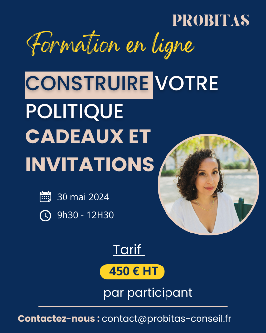 Pour ceux qui ne peuvent pas assister à nos ateliers en personne, nous avons développé une formation flash à distance pour vous aider à construire votre politique en matière d'invitations et de cadeaux.